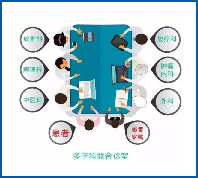 多学科会诊(Multi-DisciplinaryTreatment)是由多学科资深专家以共同讨论的方式,为患者制定个性化诊疗方案的过程,尤其适用于像肿瘤这种复杂疾病的诊疗。在MDT模式中,患者在治疗前可得到由内外科、影像科、放疗科、介入科、中医科及相关学科专家等组成的专家团队的综合评估,以共同制定科学、合理、规范的治疗方案。