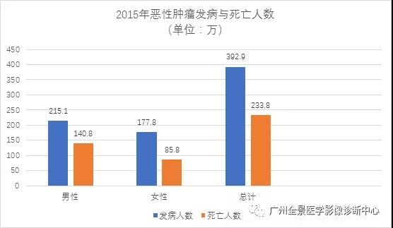 据估计,2015年全国新发恶性肿瘤病例数约为392.9万例,其中男性约为215.1万例,女性约为177.8万例,平均每分钟有7.5个人被确诊为癌症。2015年全国恶性肿瘤死亡例数约为233.8万例,其中男性约为148.0万例,女性约为85.8万例。